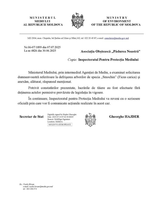 „Ministerul, prin intermediul Agenției de Mediu, a examinat solicitarea dumneavoastră și comunică faptul că defrișarea arborilor de tip «Smochin» a fost efectuată fără documentele de autorizare prevăzute de legislația în vigoare. În perioada următoare, Inspectoratul pentru Protecția Mediului va expedia o scrisoare oficială cu informații despre măsurile întreprinse în acest caz.”