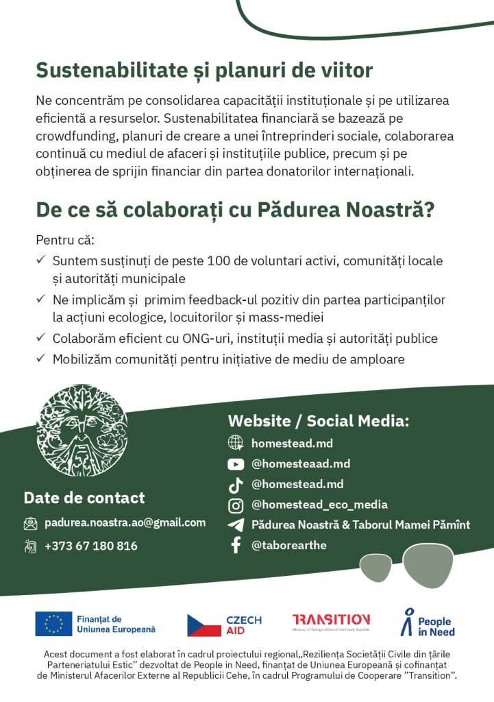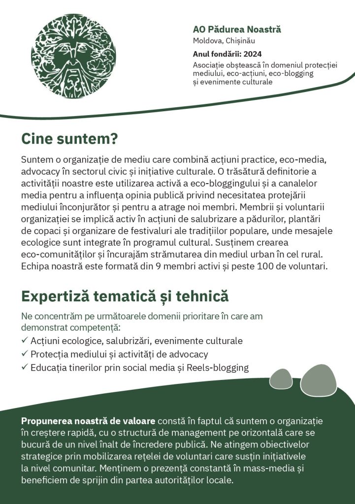 A.O. „Pădurea Noastră” este o organizație ecologică și culturală care activează în Republica Moldova. Îmbinăm activitățile de protecție a mediului cu inițiative culturale și proiecte educaționale dedicate comunităților locale.