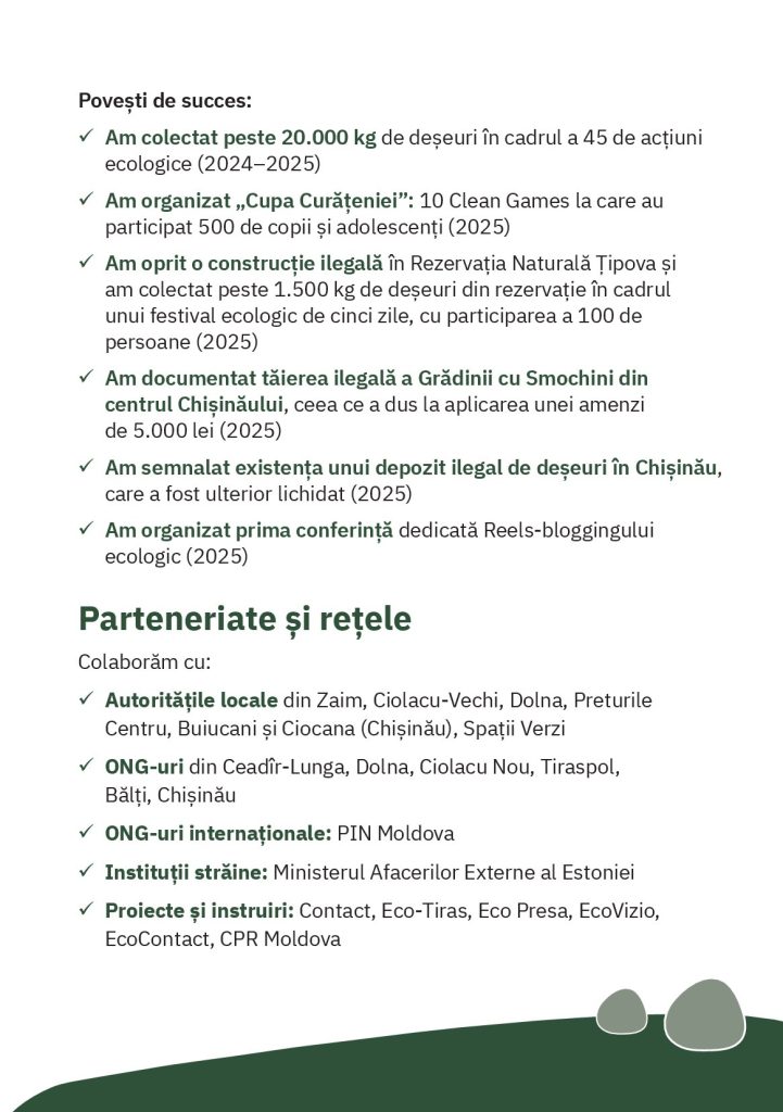 De asemenea, susținem eco-satele din Moldova și încurajăm mutarea din orașe în mediul rural. Echipa noastră este formată din 9 membri activi și peste 100 de voluntari.